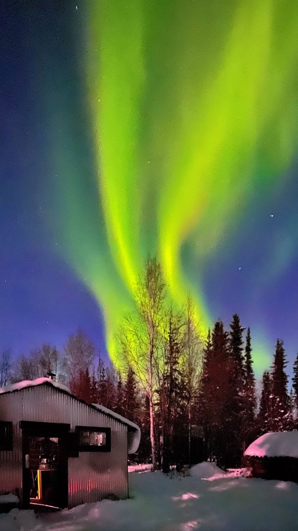 The self-proclaimed travel junkie snapped an undulating ribbon of green and yellow light over a cabin in Coldfoot, Alaska.