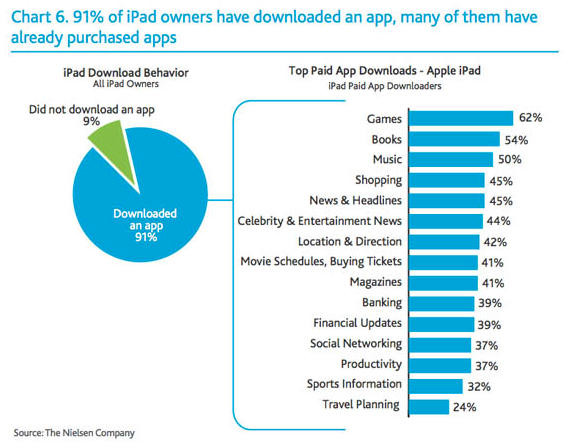 We bought it — after all, the iPad is a compelling device right out of the box without ever plugging in a credit card company — but it looks like we were being overly credulous. Nielsen Group, who originally posted the numbers, has just released a huge honking update on their previous numbers… this time claiming that only 9% of iPad users have never downloaded an app.