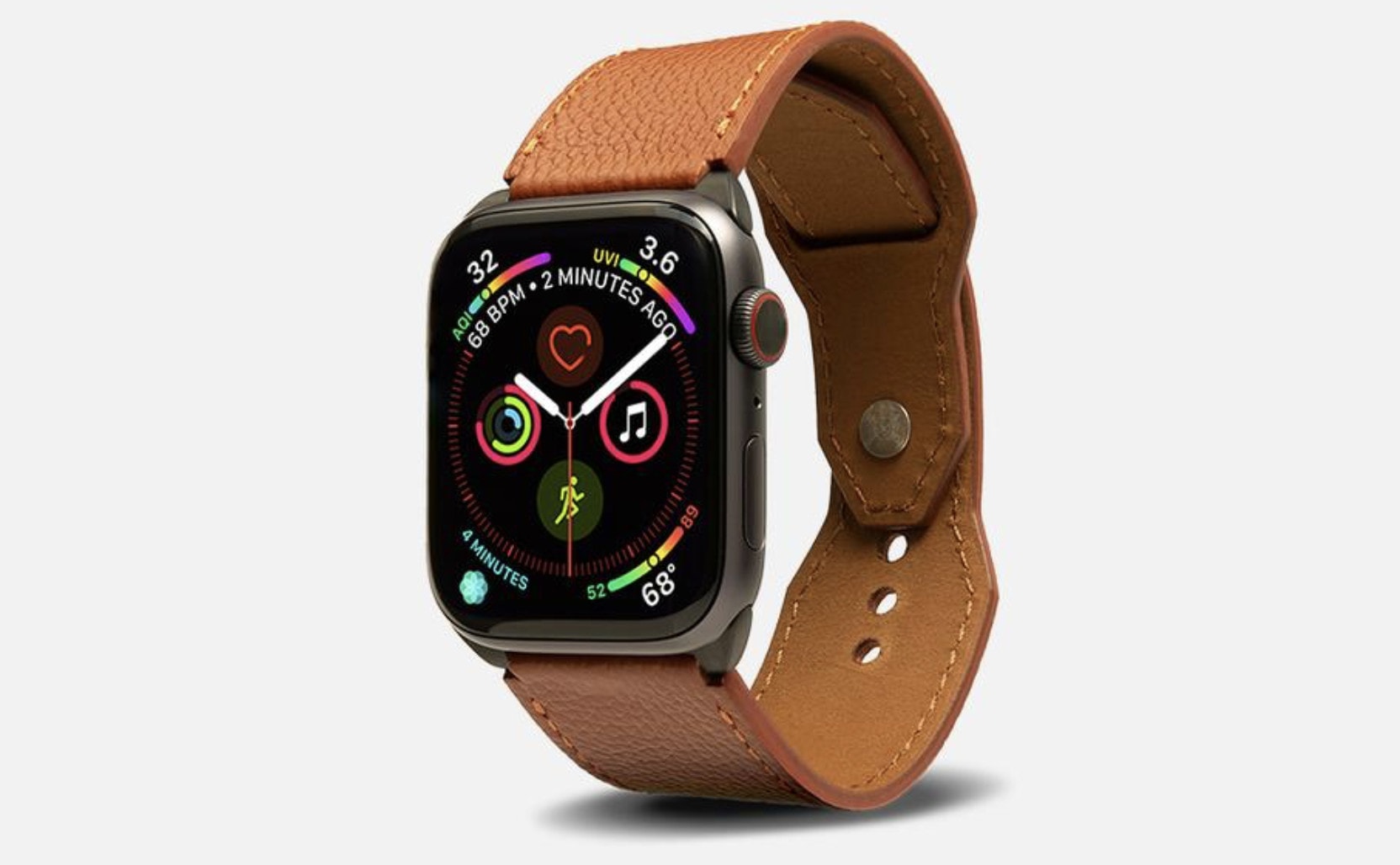 The classic leather band is compatible with both 38/40mm and 42/44mm Apple Watch models, and it comes in black, brown, or gray.