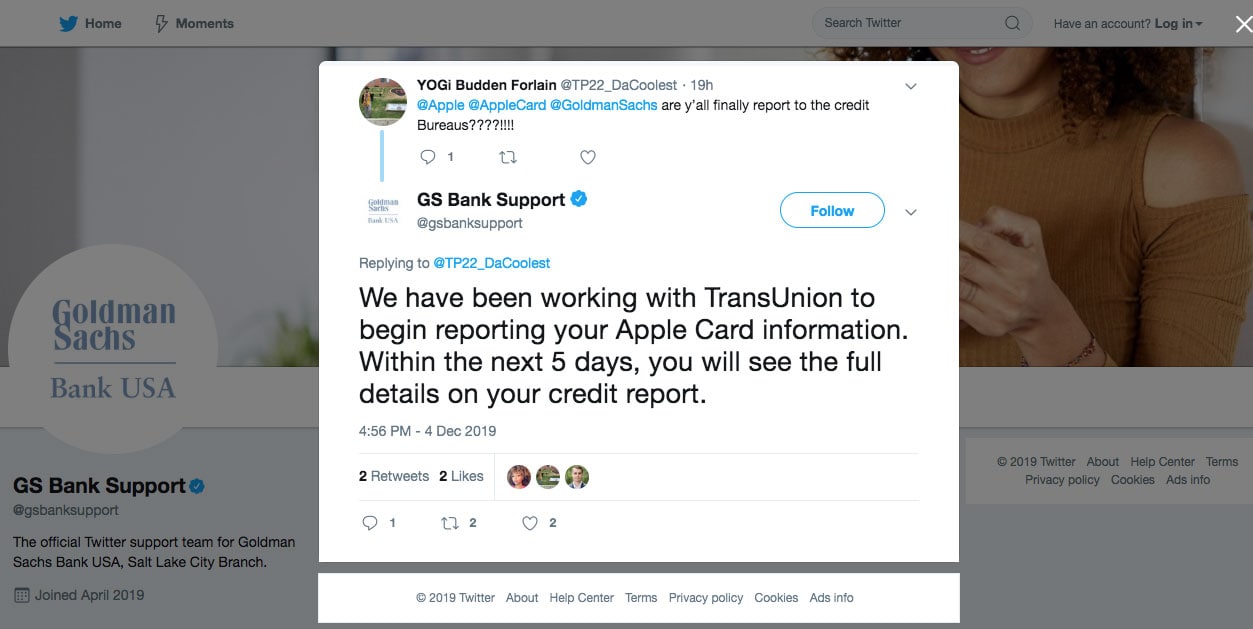 Goldman Sachs, the bank behind Apple Card, says it is working with credit bureau TransUnion in reporting cardholder information.
