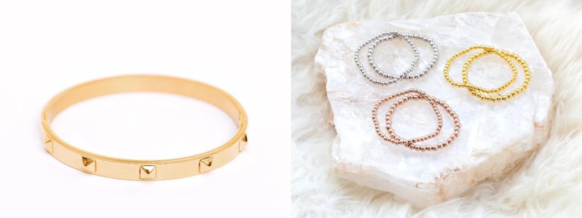 For a little extra bling, Goldenerre’s bracelets can be combined with a range of beautiful bangles. The Stud goes great with the Stud and Hammered Link bracelets, while the Classic Link is — as you might have guessed — a perfect match for the Classic Link.