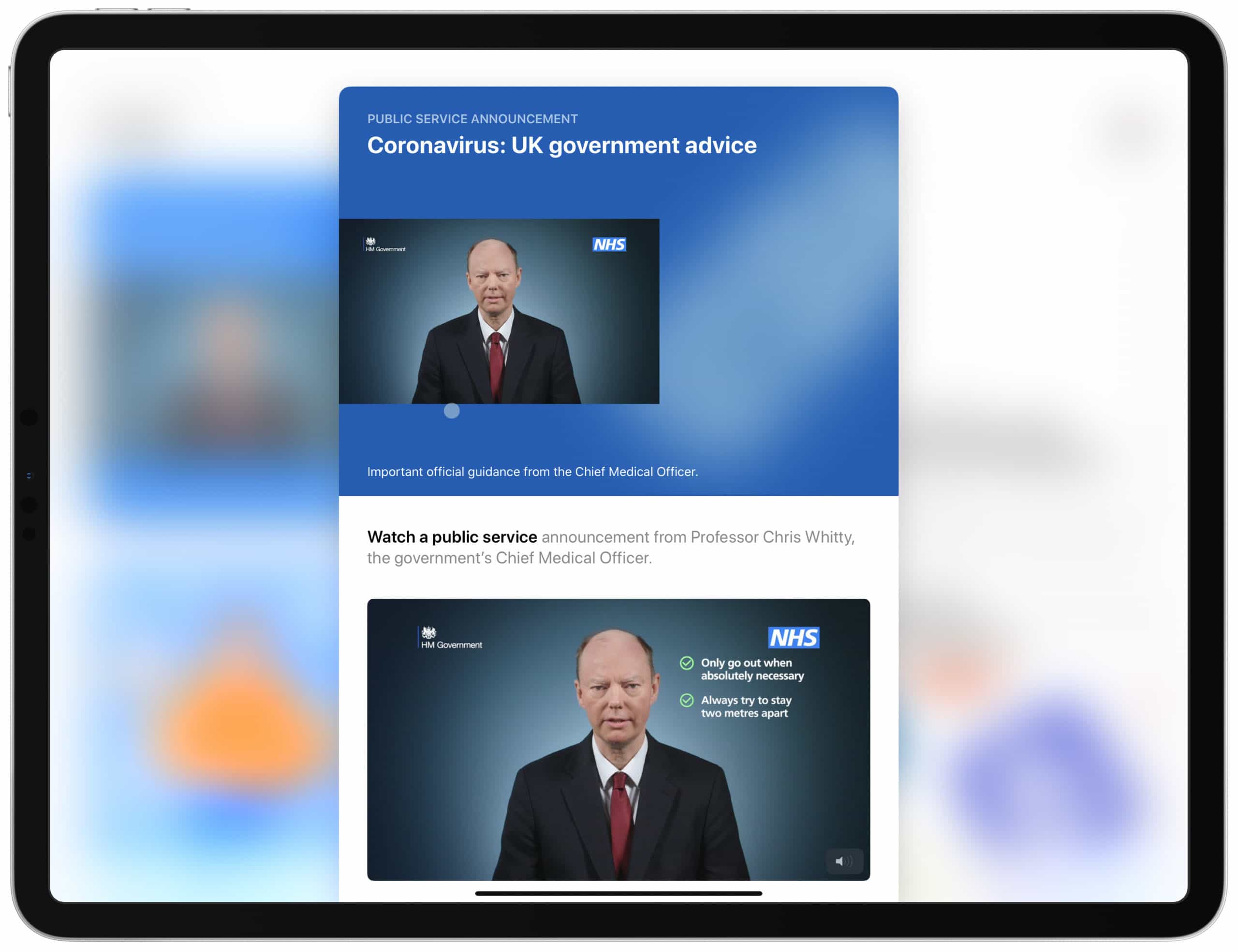 Immediately after opening the App Store, at the top of its Today tab, you will see a new card titled “Coronavirus: UK government advice.” Tapping it lets you watch the PSA from Professor Chris Whitty.
