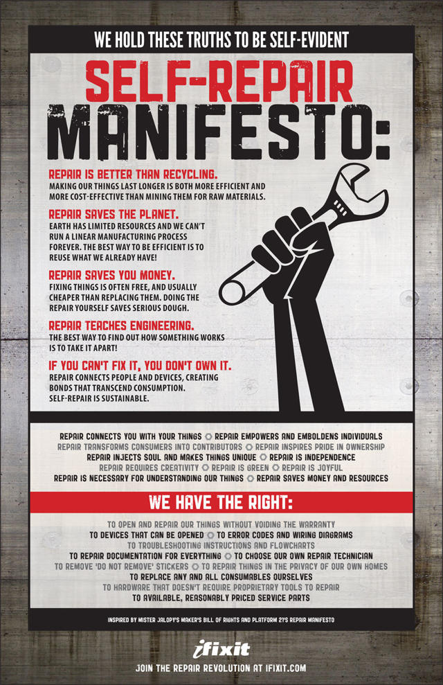 So does iFixIt, teardown-masters extraordinaire and longtime information and parts resource for Apple users. They have just published the Self Repair Manifesto, along with an ambitious call to action to create – via crowd-sourcing – a Wikipedia-style Free Repair Manual for devices of all kinds: electronics, appliances, even a few cars.