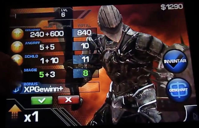 Glommed on top of the sword fighting mechanics is a simplified RPG level-up mechanic, although even this is unorthodox. After each duel, your character is awarded a set amount of experience, part of which goes directly to his level. Every level gained gives your character two status points to assign to either health, attack, magic or shield. All pretty typical so far. Where Infinity Blade gets unique is by then dividing your remaining XP by five and assigning them to your equipment (sword, helm, shield, ring and armor). With every chunk of XP your equipment gains, so do you, but equipment can only absorb so much XP before it becomes “Mastered.” Once a piece of equipment is mastered, it will no longer give your character any XP towards his level, so if you want to keep leveling up in Infinity Blade, you constantly need to be changing out mastered items in your inventory for unmastered items.