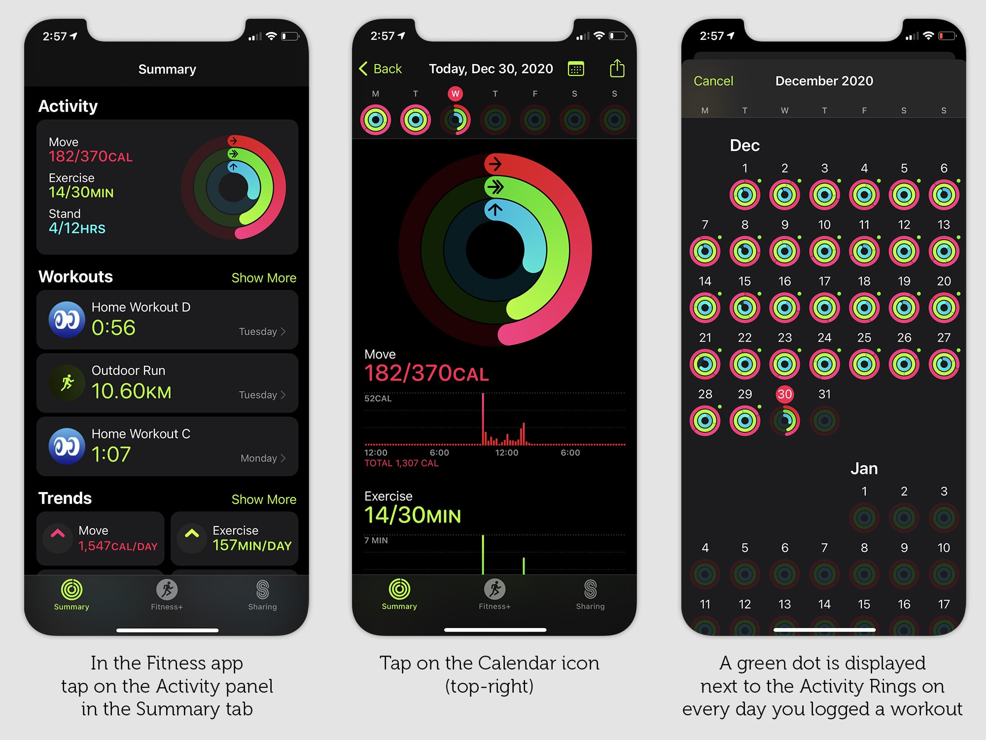 The Fitness app provides an easy way to check your streak at a glance. In the Summary tab, tap on Activity and then tap the Calendar icon (top-right). A green dot is displayed next to the Activity rings on each day you logged a workout.