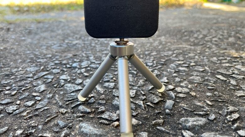 If you need the iPhone screen or camera higher up, or at a different angle, you can attach Mophie’s power bank to a tripod. It has a standard ¼ inch, 20 threads per square inch tripod socket.