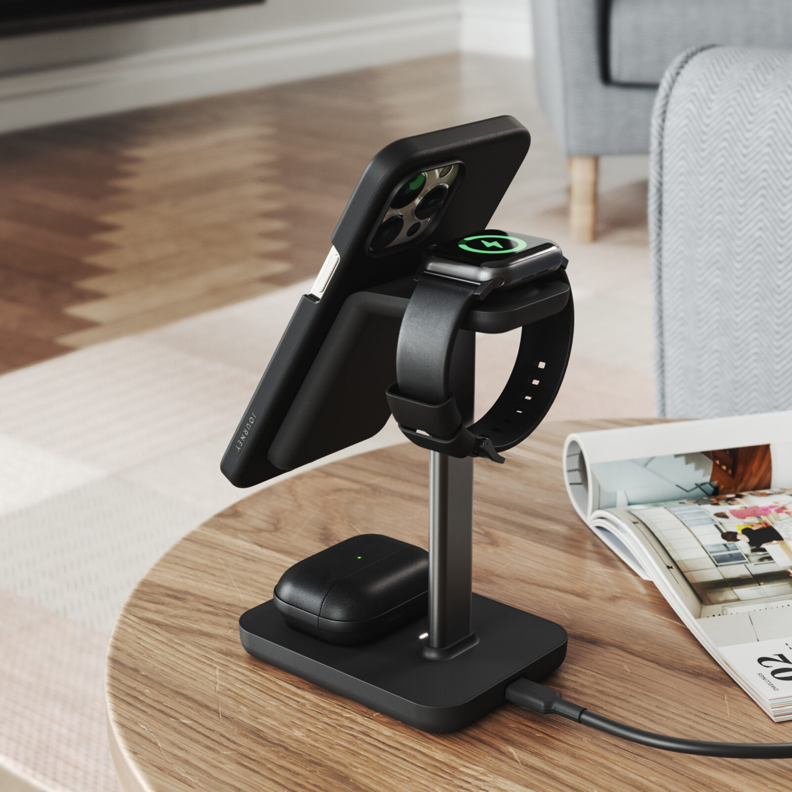 The 3 in 1 Wireless Charging Station comes in black or white. The bold, modern design will fit the decor of any room and will take up minimal space. Its sturdy, anti-slip base and self-aligning magnets make it simple to start charging effortlessly.