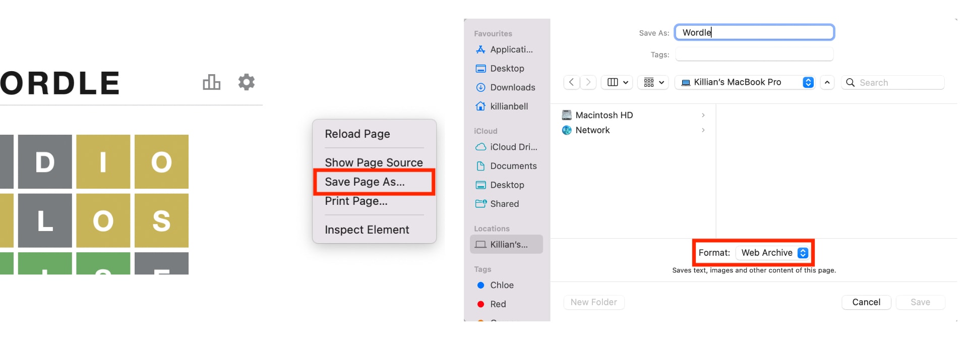 - Change the Format to Web Archive (if you forget to do this it won’t work properly) then click Save.