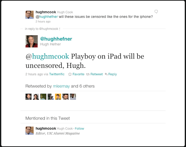 Hugh Hefner, founder of the Grandaddy of all girlie mags, Playboy, tweeted Tuesday evening that an “uncensored” Playboy is coming to iPad.