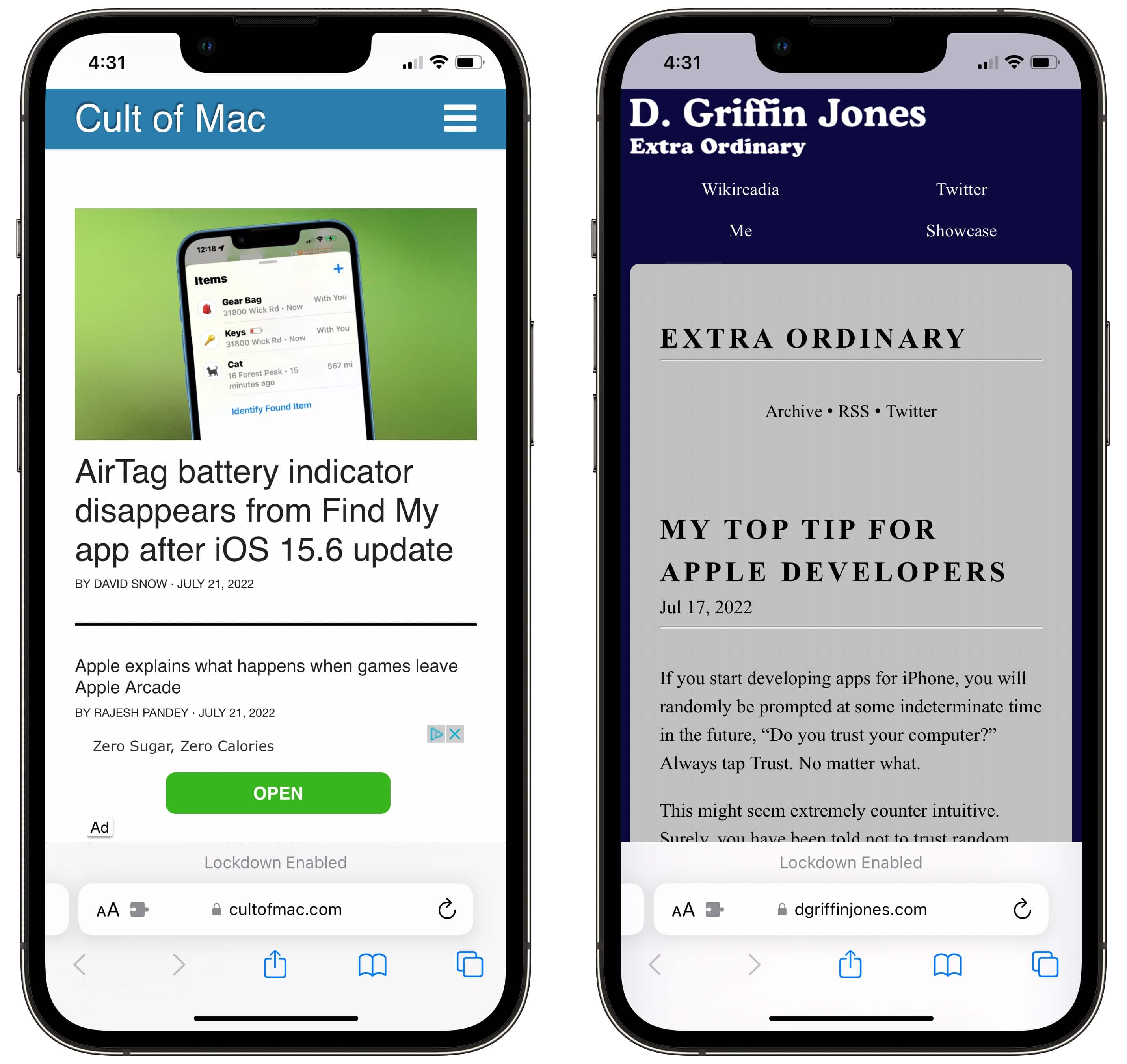 Browsing the web in Lockdown Mode, I wasn’t very much caught off-guard by the lack of JavaScript just-in-time compilation. Instead, what I immediately noticed is that custom fonts aren’t loaded. My website uses Cooper Old Style, but in Lockdown Mode, it replaces it with Times New Roman, which I find viscerally unsettling. The Cult of Mac homepage swaps our iconic font Museo for Helvetica, which looks boring in its place.