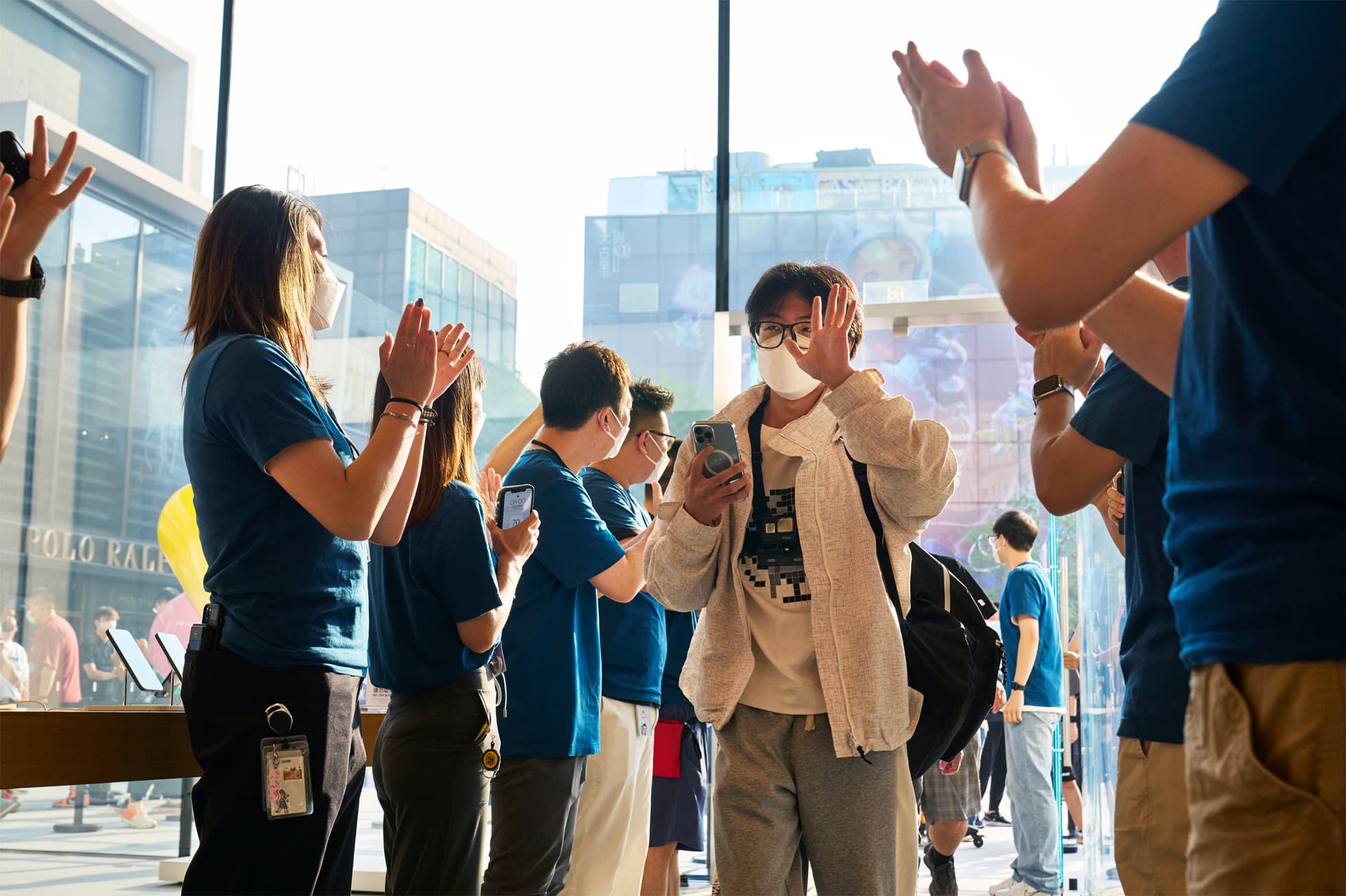 Apple CEO Tim Cook made launch-day appearances at Apple retail outlets in New York City. He posted photos to Twitter showing Apple team members as well as excited customers.
