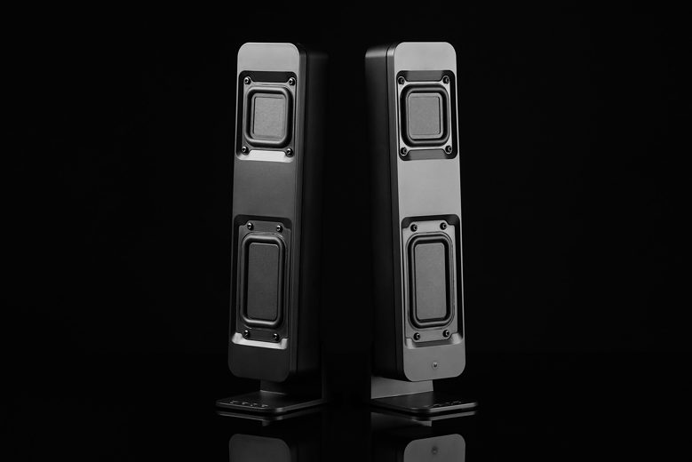 Notably, the new speakers sound virtually the same whether you orient them vertically or horizontally, Drop said. So you can fit them to your workspace without compromising on audio quality. Vertically, they could stand on either side of display, for example. Or they could be laid on their sides underneath it.