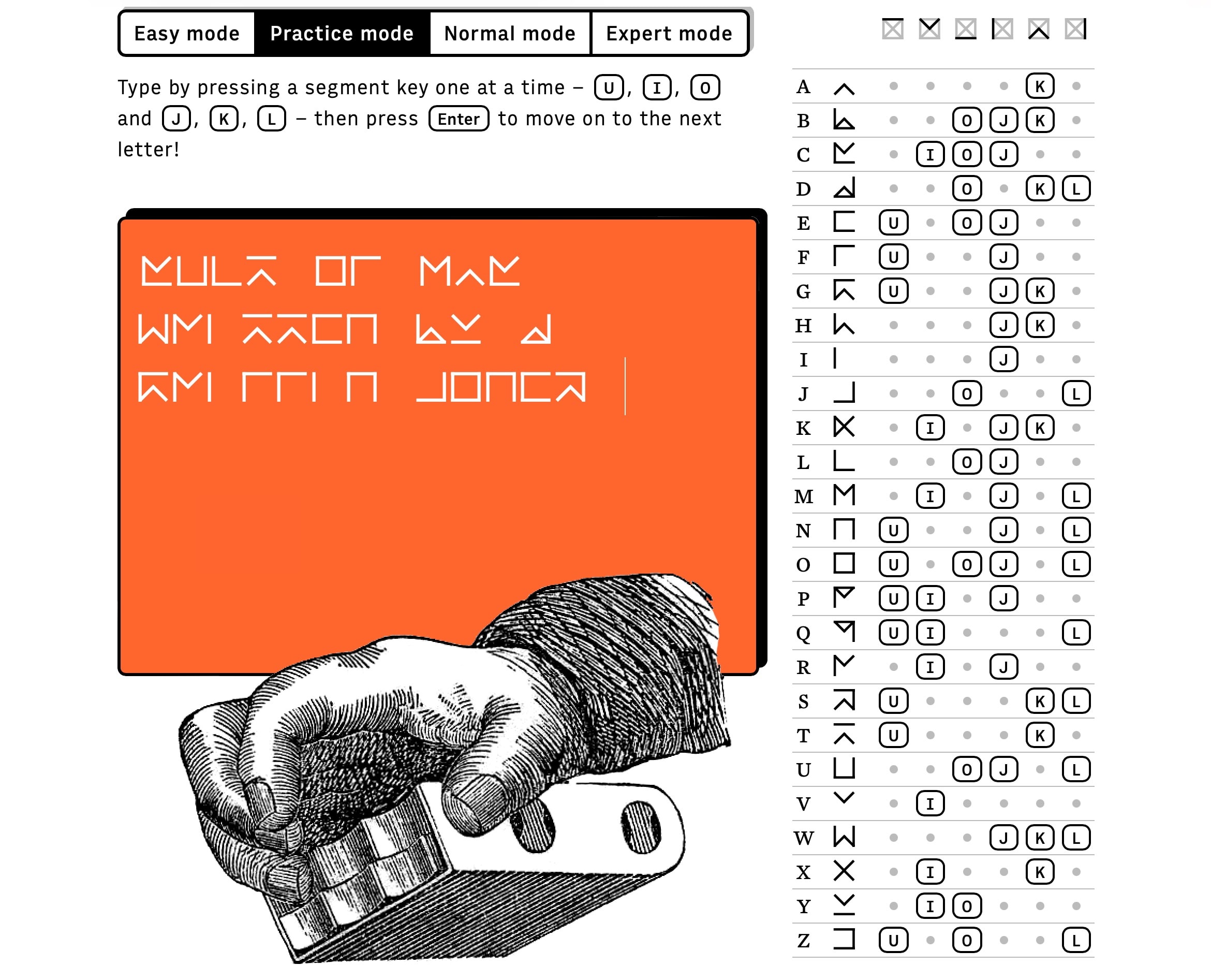 Another simulates a chording keyboard. Use just six keys on your own keyboard to type all 26 letters, pressing different combinations of U, I, O, J, K and L.