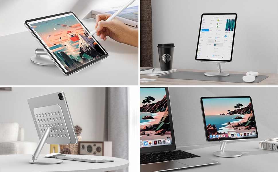 Made from premium and reinforced aluminum alloy, with a heavy-duty base to support your device comfortably and securely, this sturdy tablet stand comes with an antislip silicone band to ensure your device remains secure. Plus, its scratch-resistant fabric protects hard surfaces.