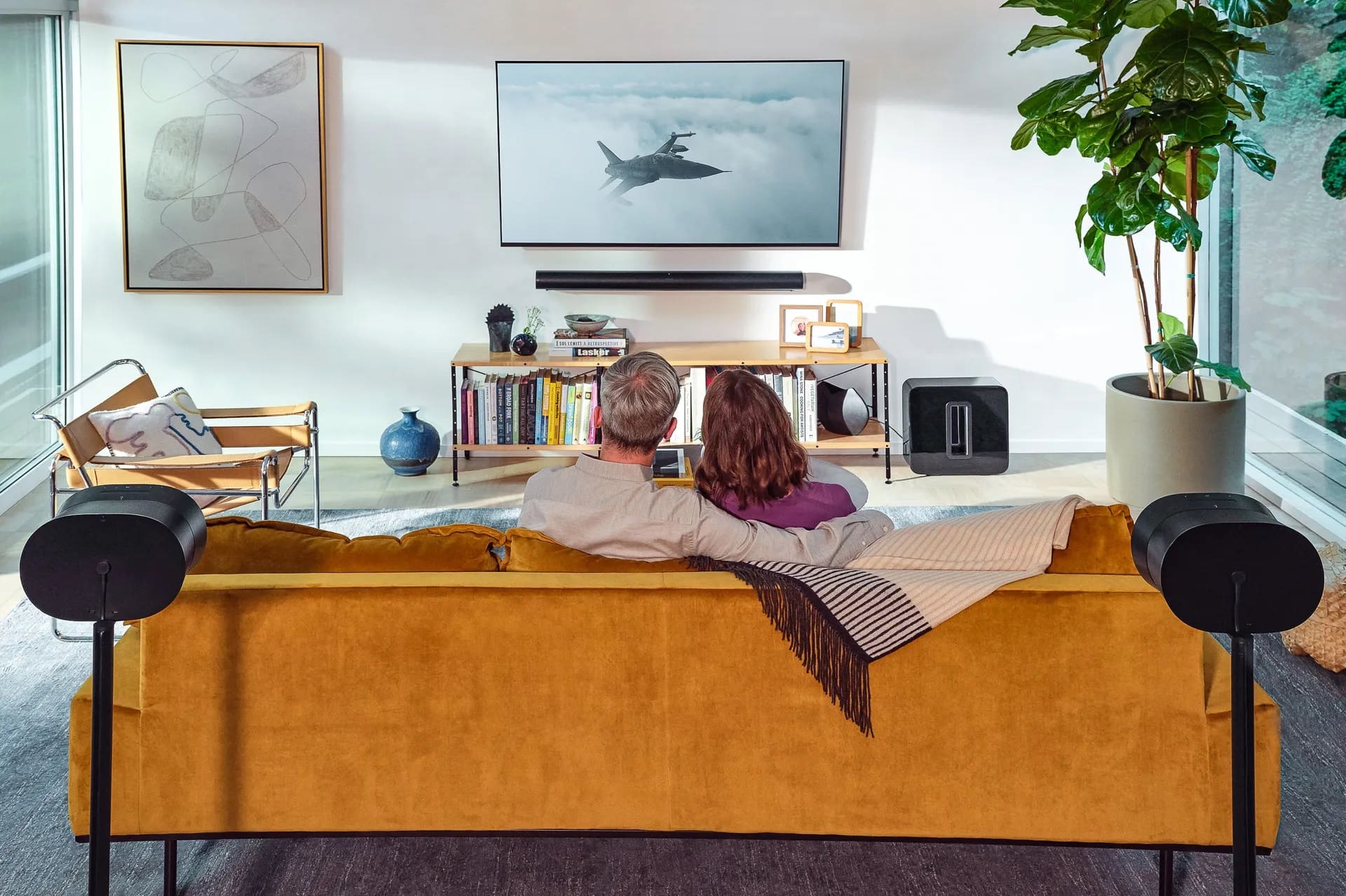 That said, you can incorporate the Era speakers with Sonos soundbars for surround-sound in a home theater situation. In the marketing photo above, a pair of Era 300 speakers are mounted for rear-surround-sound to go with a Dolby Atmos-capable sound bar mounted on the wall under the TV.