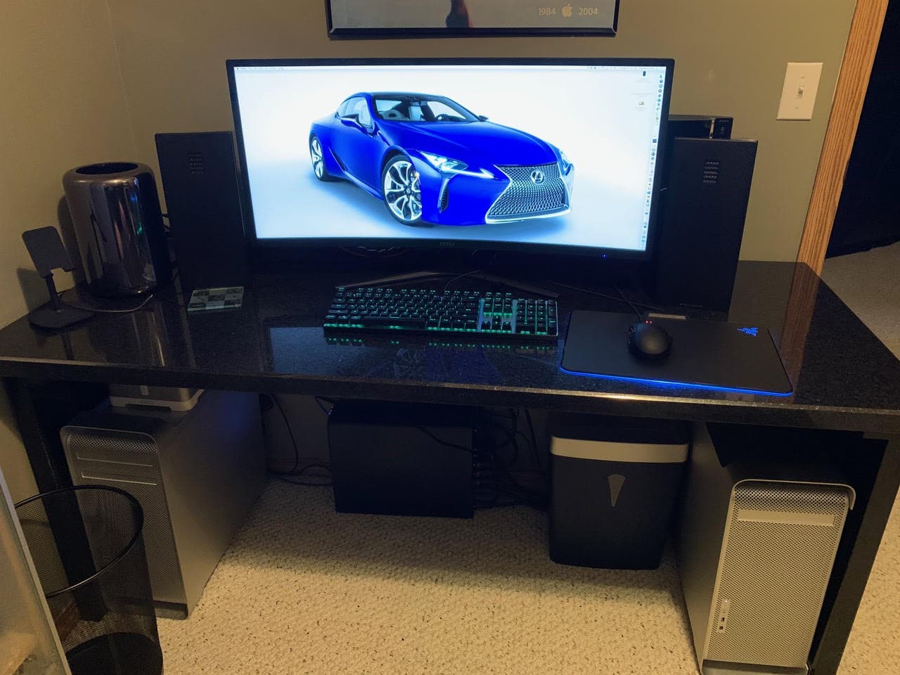 “The older picture is of my 2013 MacPro on the desk, a PS3, the Martin Logan Motion 4i speakers driven by older Sonos Amp, an MSI 34-inch curved screen, a G5 Tower and a 2010 Mac Pro tower shared with an Aukey keyboard, Razer Mousepad and Razer Mouse with an ioGear KVM switch,” De Jong said, describing the images immediately above and below.