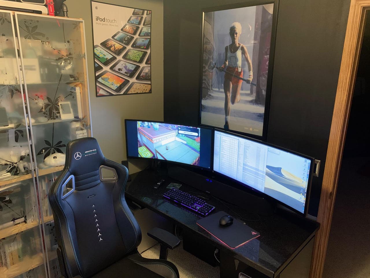 “I wall mounted the 34-inch MSI with a 34-inch LG curve screen so as I have more pixels to work with. I also complimented the desk with a Noble gaming chair,” De Jong said.