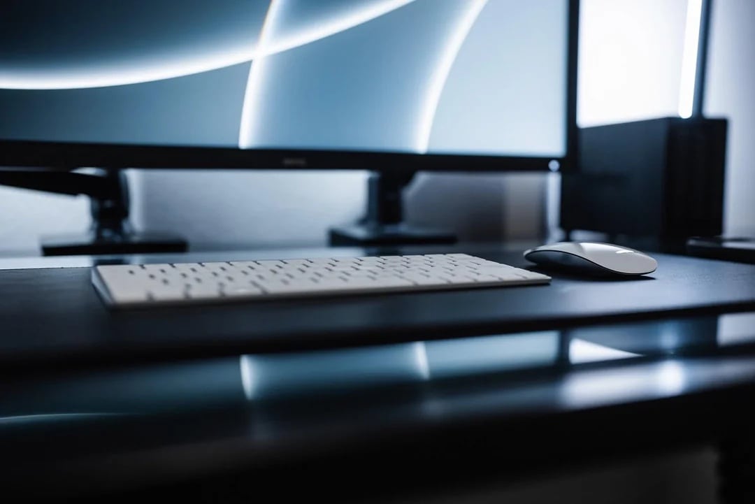 The Magic Keyboard mini and Magic Mouse 2 sit on a nice leather Satechi desk mat that rests on a Impresa tempered glass blotter. And it’s all held up by a Fully Jarvis standing desk.