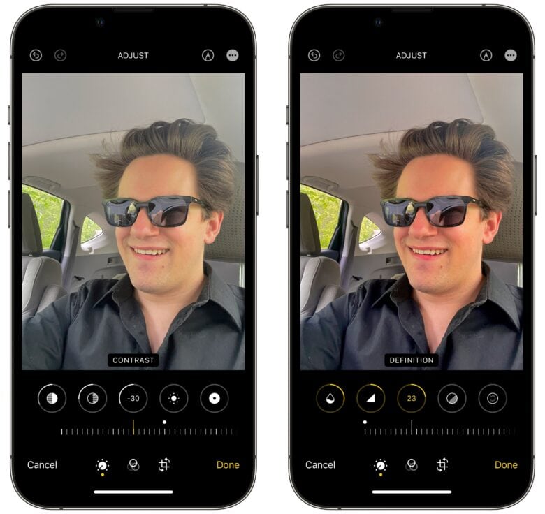 All of these effects, in total, will make any picture look like it was taken at sunset. The colors pop with a warmer tone, and the overall brightness and highlights are significantly reduced. Editing selfies to boost their sharpness and definition can make pictures snapped with the iPhone’s front-facing camera look as clean as ones taken with the larger rear camera.