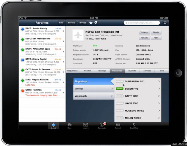 Pilots have been enthusiastic about the iPad and its ability to display radar and satellite weather maps in rich color, whether in the boardroom or on the ramp. The device can download and store charts, approach plates, taxi diagrams and checklists—or entertain passengers with an in-flight movie.