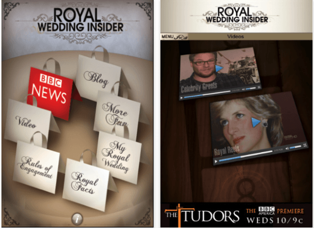 Among them are the Royal Wedding Insider from BBC America (with an unfortunate ad for The Tudors miniseries in it), The Royal Wedding from Hello! Magazine as well as offerings from NBC , one from People that allows you to print your own commemorative stamp and a virtual tea towel app.