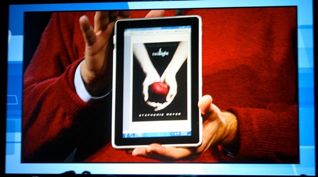 Although it was on stage at the Las Vegas Hilton for only a couple of minutes, the HP Tablet looks thin and polished — hardware wise anyway. Ballmer showed it running Windows 7 and Amazon’s Kindle for the PC software.
