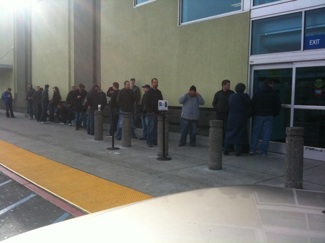 Here’s the 15th guy in line at San Fancisco’s Best Buy on Harrison Street (the one sitting down). Everyone behind him — and there’s about half-a-dozen — better have both fingers crossed. There’s reportedly only 15 iPads at each Best Buy (but the limit is one-per-customer). Doors open any minute now. Good luck guys!