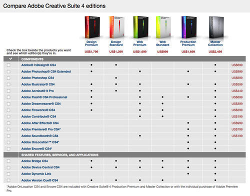 The entire product line includes Adobe Creative Suite 4 Design editions, Creative Suite 4 Web editions, Creative Suite 4 Production Premium and the Creative Suite 4 Master Collection.