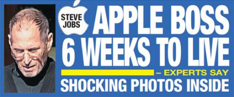 The front page of the gossip rag The National Equirer February 17 shouted about the untimely demise of Apple’s founder and CEO Steve Jobs: “APPLE BOSS 6 WEEKS TO LIVE.”