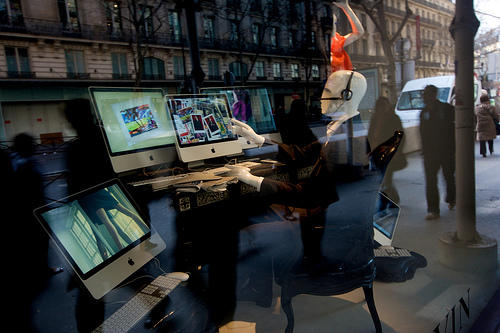 I spent a week in Paris recently, and although I was on vacation, I was still on the lookout for Macs. I almost missed this homage to the Apple design while I was out shopping with my uncle. Fortunately, he saw this excellent window display at the Printemps department store and stopped me to take some photos.