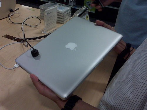 In Bridgewater New Jersey, the police blotter reports (between rock-throwing incidents and credit card theft) that someone managed to walk out of the local Best Buy with a MacBook from a display. Anyone else come across scenes of attempted five-finger discounts?