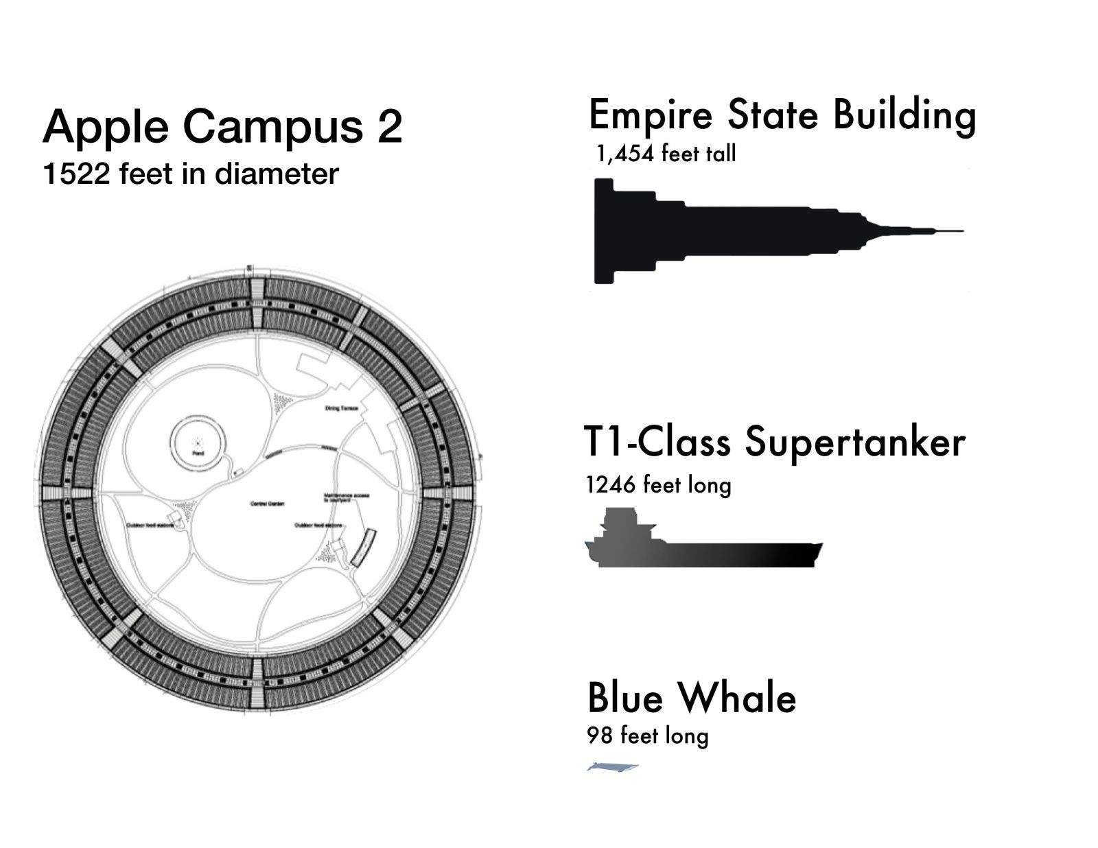 The Apple Campus 2 will have a 1,522 foot diameter, which means the Empire State Building could comfortably lie down somewhere inside its massive circular footprint. Heck, a T1-class Supertanker could fit in there, as well, with its 1,246 foot length, and you’d have to get somewhere around seven or eight blue whales–the largest known mammal on Earth–just to get across half of the diameter of the new Apple Campus. That’s a lot of krill.