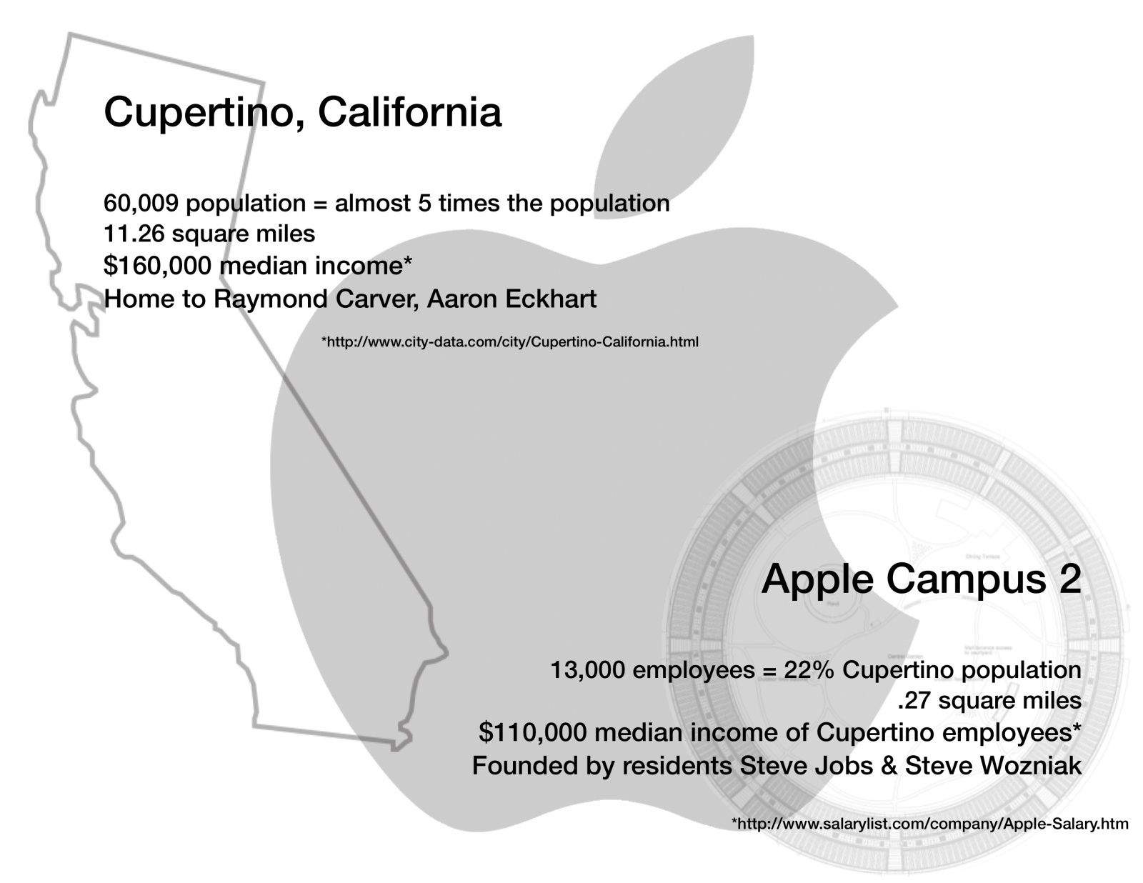 The city of Cupertino itself, home not only to Apple founders Woz and Jobs but also author Raymond Carver and actor Aaron Eckhart, only has around five times the population as will work in the Apple Campus 2. Interestingly, the median income of Cupertino-based Apple employees is a bit lower than that of Cupertino in general, but perhaps that’s just a function of how much larger the city is than the building. Which, to be honest, doesn’t seem to be that much of a news item. It is, however, funny that a .27 square mile building can cause the kind of traffic jams that the city of 11.26 square miles seems to be mostly worried about.