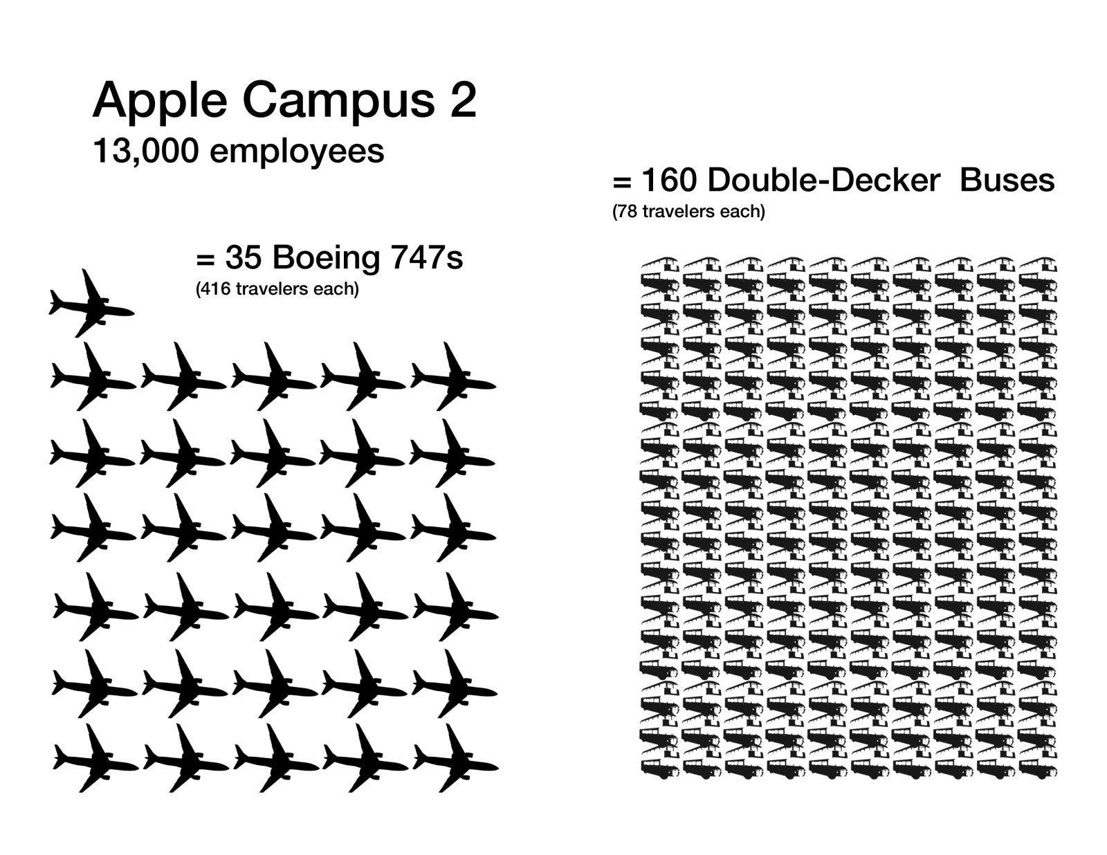 The spaceship campus has plans to hold 12,000 employees within it’s solar-panel-using, green technology hallowed halls, which would fill something like 160 double-decker buses, or 35 Boeing 747 jets. The Apple folks will have it easier, as they’ll at least be able to get nice food there, and a much less foggy view in Cupertino than in London.
