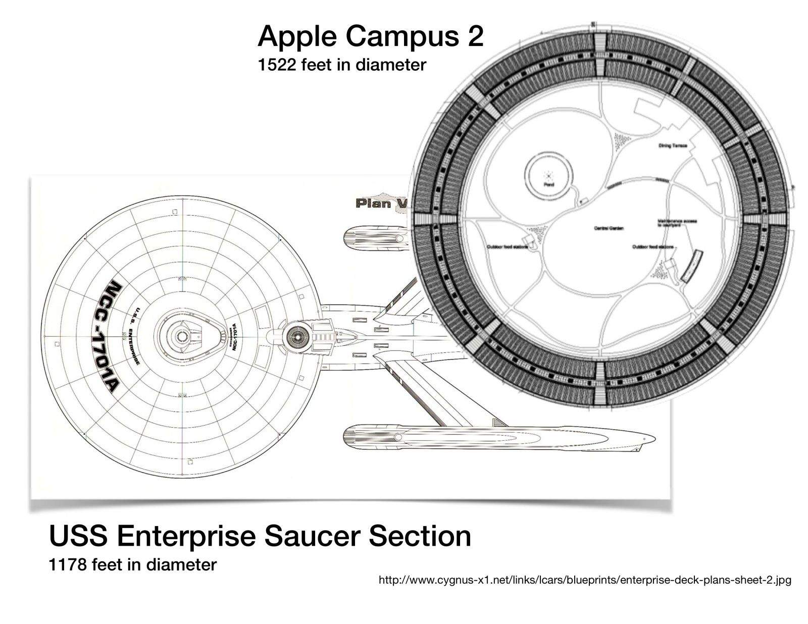Of course, no look at anything tech-related is complete without a comparison to a fictional starship, and since we’ve been calling this the spaceship campus since Steve Jobs unveiled the design two years ago, it seemed fitting to see how it stacks up against the USS Enterprise. Unfortunately for trekkies, the new Apple Campus 2 has a diameter quite a bit larger than the original Gene Roddenberry creation.