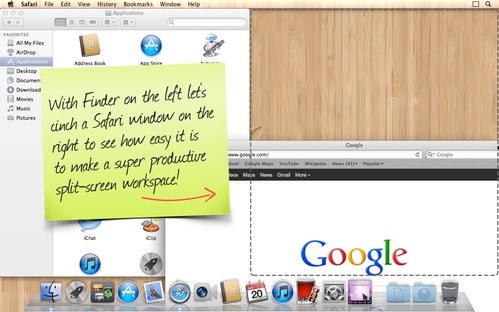 Cinching to the left or right edges of the screen will resize the window to fill exactly half the screen, allowing you to easily compare two windows side-by-side (splitscreen).