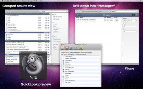 Tembo – an efficient search tool based on the Spotlight engine. It makes searching (and finding) files, mail messages, bookmarks, and just about anything better.