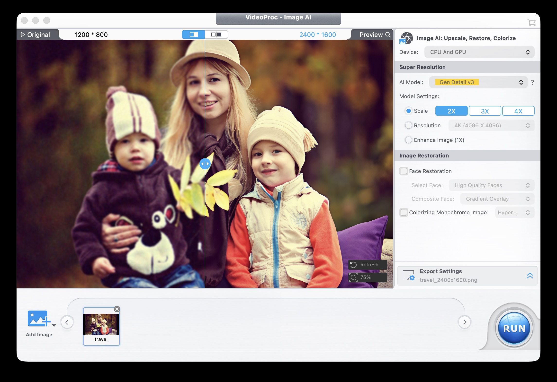 The Face Restoration feature specifically targets portrait photography. It recovers intricate details in hair, skin texture and facial features across three different processing modes. Whether you’re working with old family photos or trying to salvage group shots with less-than-ideal focus, this tool delivers remarkable results.