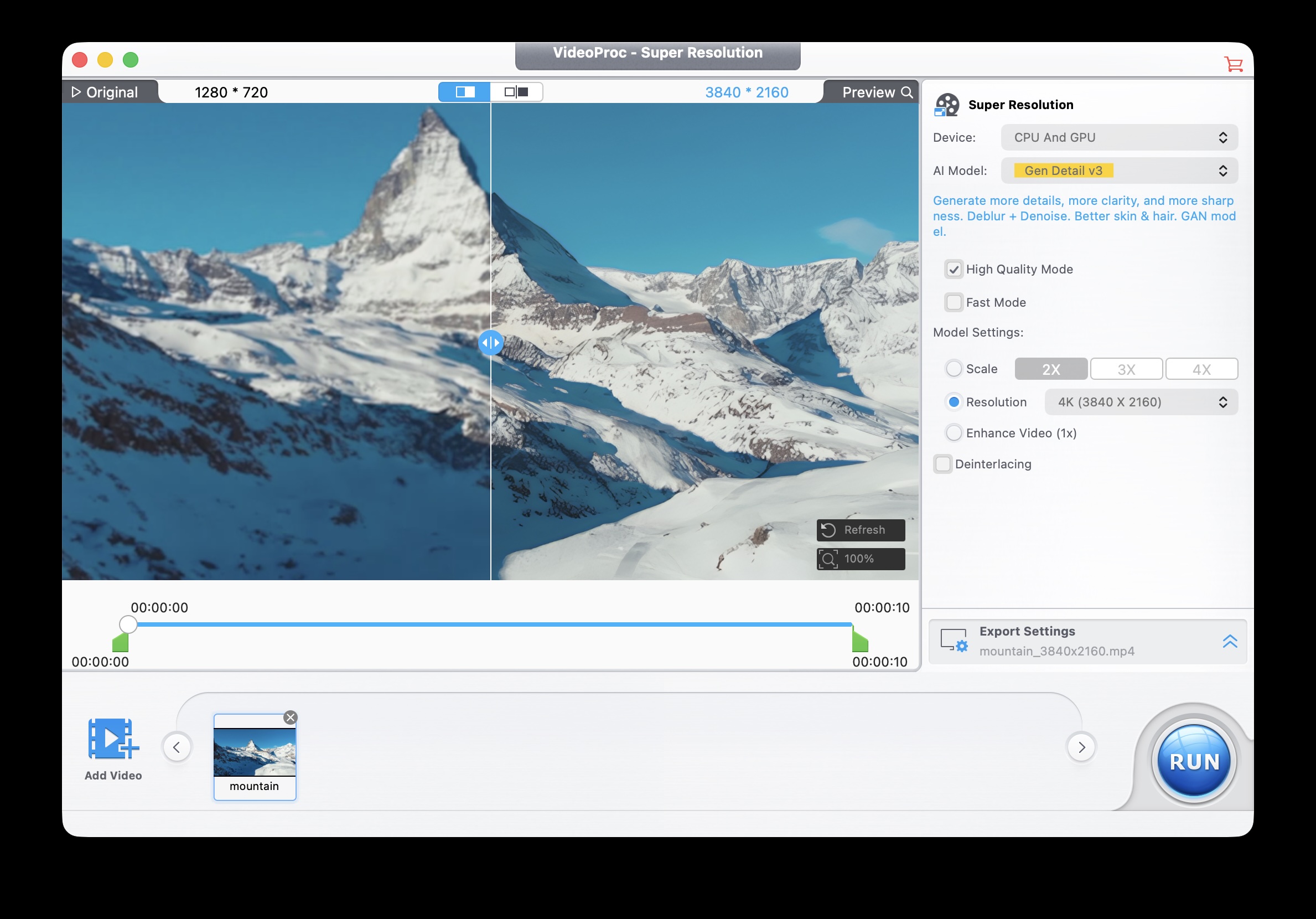 This capability proves invaluable for Mac users dealing with various quality challenges: think old iPhone recordings, vintage camera footage, downloaded clips with compression artifacts, or decades-old DV tapes collecting dust. The latest V8.6 update expands codec support to include AV1, ProRes and HEVC, while adding MKV output for multilingual video projects. Those are features professional editors will appreciate.