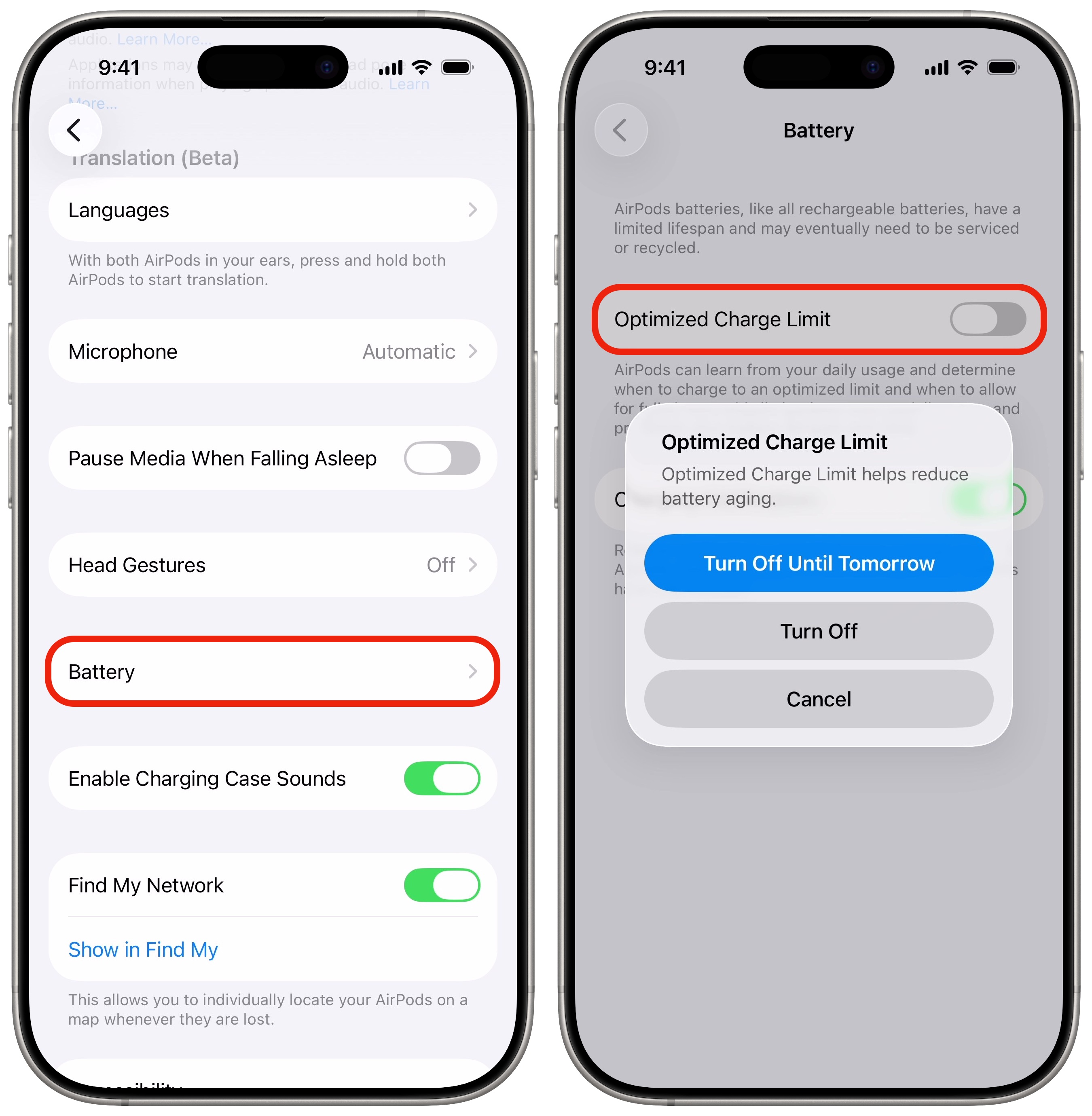 Once connected, open the Settings app. Your AirPods should show up at the top. (On a Mac, it’s at the bottom of the sidebar.) Then, scroll down to Battery, tap that, then tap disable Optimized Charge Limit. When you turn off this setting, Apple gives you a choice: