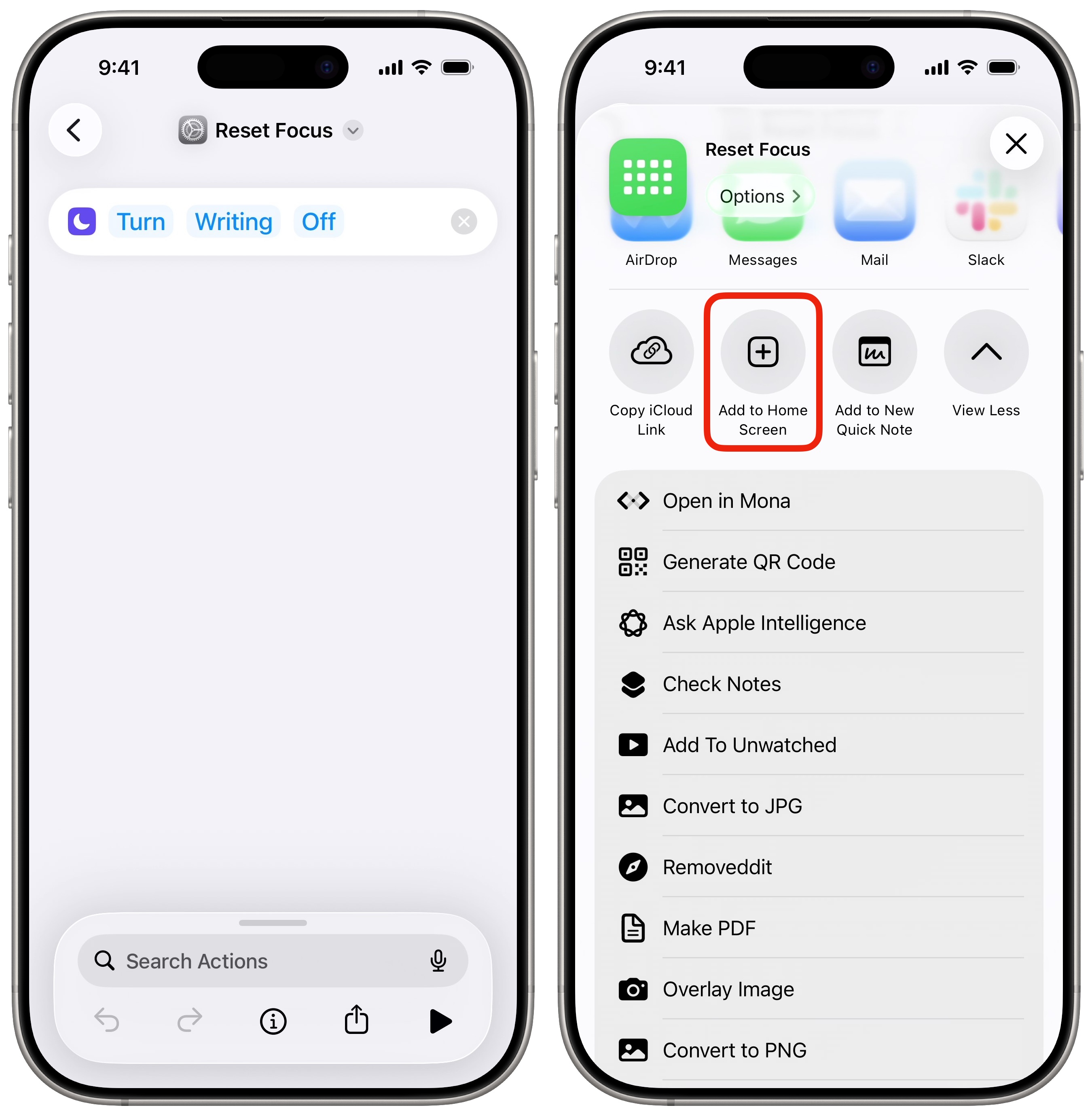On all of my custom Home screens, I have an icon that instantly turns off the Focus mode. It’s much faster than opening Control Center and switching back. I also made this using Shortcuts.