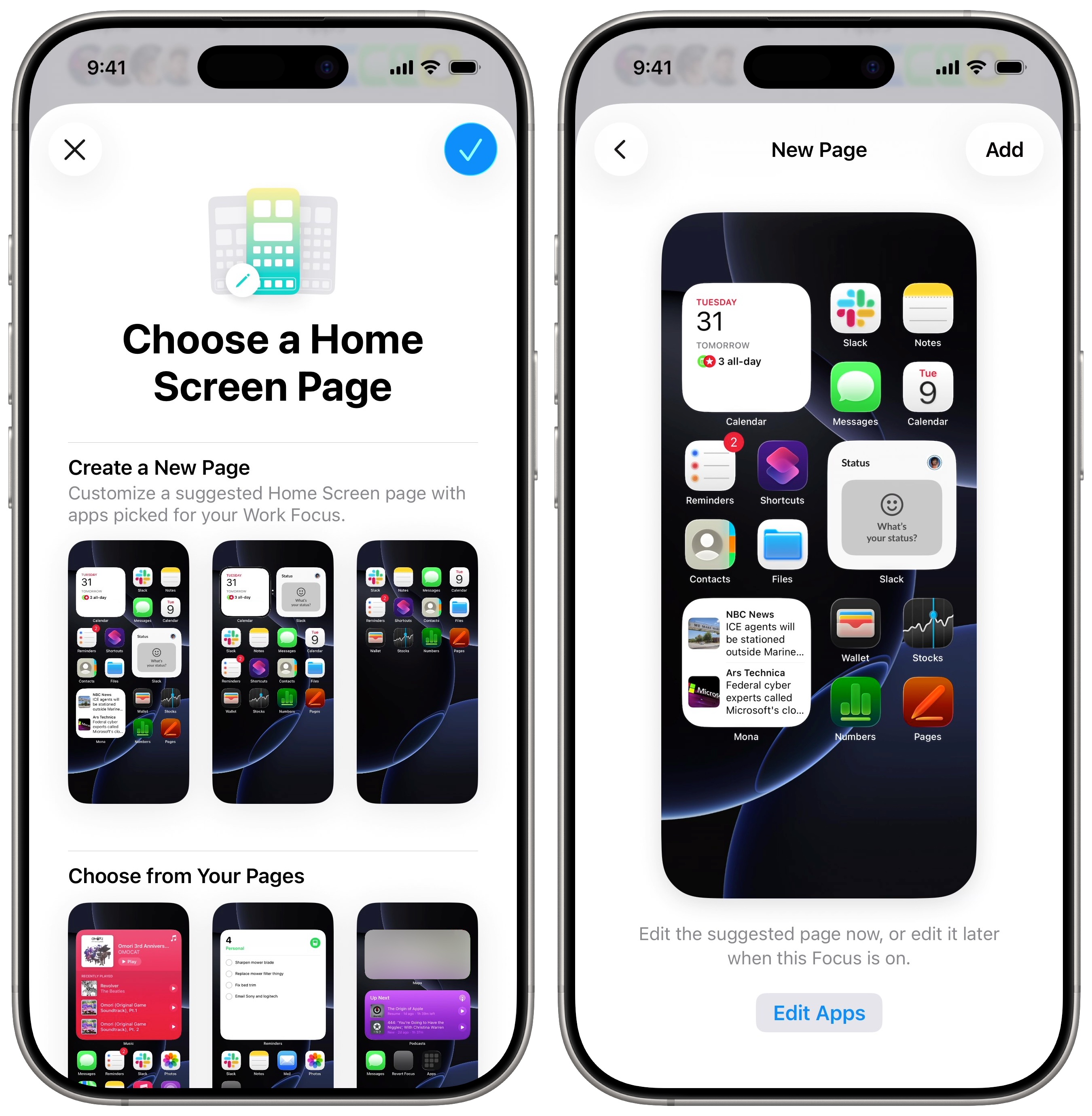 Every Focus mode can have a different Home Screen associated with it, too. You can tailor your Home Screen with specific apps and widgets. For example, you can fill your Work Home screen with apps like Slack, Google Drive, Dropbox, Notion and more. Your Travel focus can feature apps and widgets you use for shopping and travel. Your Personal focus can feature social media and entertainment apps you use at home (or your original home screen when no Focus is set).