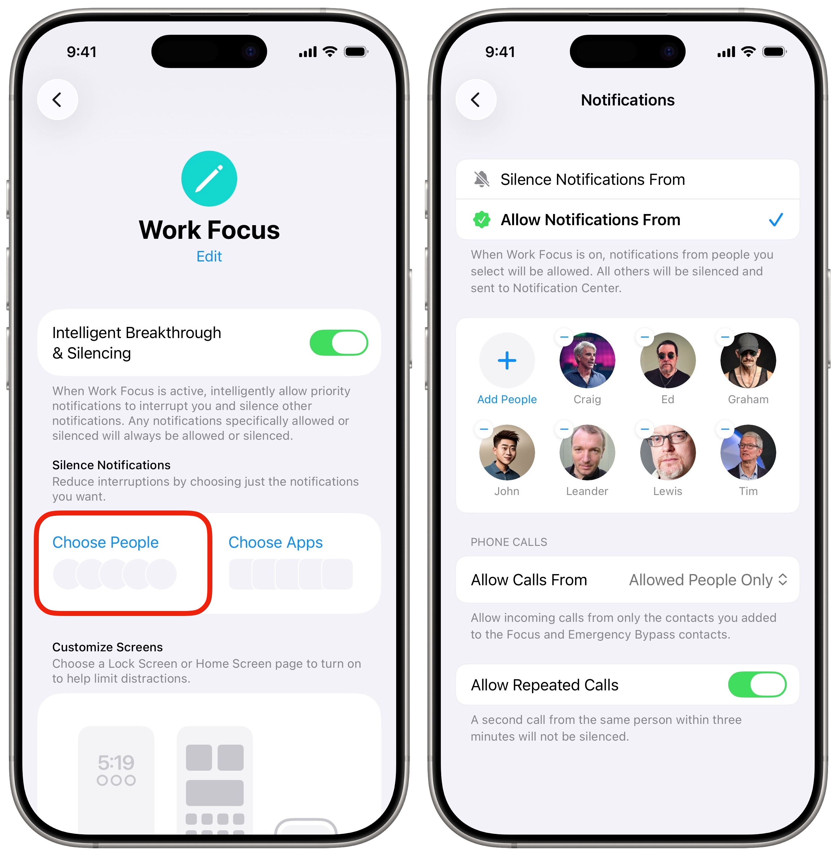 Next, you choose who’s allowed to send you notifications in your focus. Tap People to pick contacts.