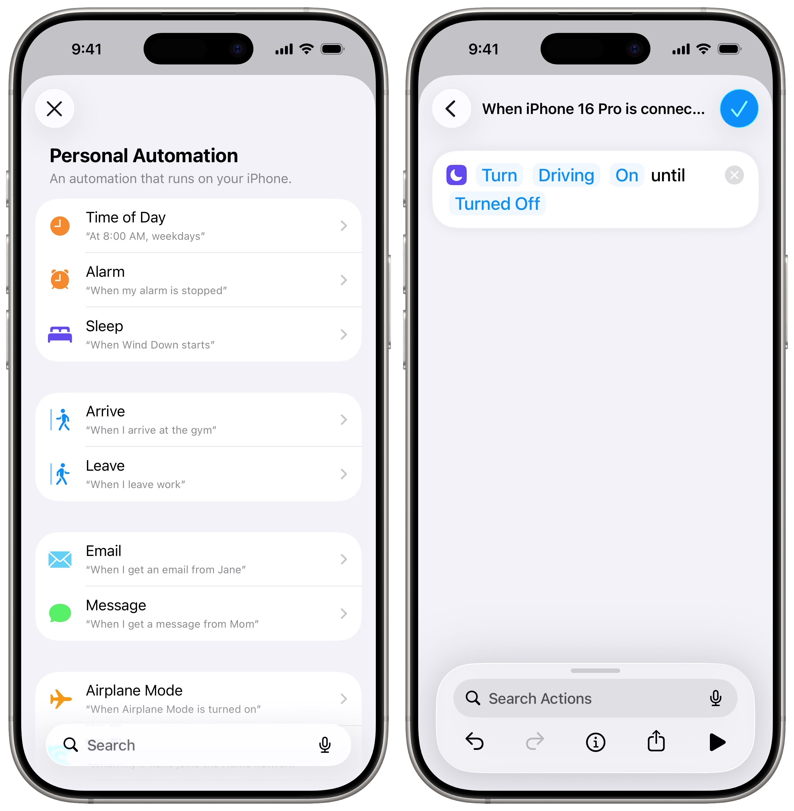 Let’s say I want to activate my Driving focus every time my phone connects to my car’s Bluetooth system. I’ll select Bluetooth from the list of automations, choose my car, tap Done and Next. Tap Add Action and search for the Set Focus action. The default action is “Turn Do Not Disturb Off,” so I’ll tap on the highlighted words to change it to “Turn Driving On.”