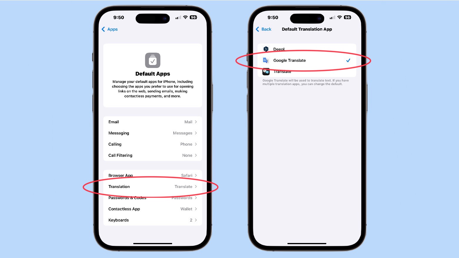 Next, change Translate to Google Translate (or another third-party translation you prefer). Then you’re ready to go with Google Translate as your iPhone or iPad’s new default translation app.