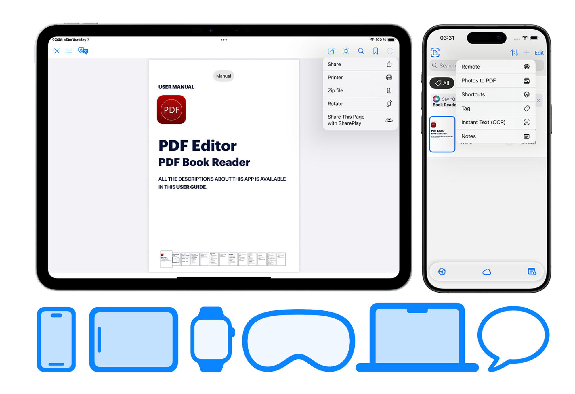 PDF Editor ,PDF Book Reader ® isn’t just another PDF viewer — it’s a complete digital document workspace that seamlessly blends robust editing features with user-friendly design. Whether you’re diving into a novel, editing a contract, scanning handwritten notes or collaborating on a presentation, this app serves as your all-in-one PDF companion for iPhone, iPad, Mac, Apple Watch, Vision Pro and even iMessage.