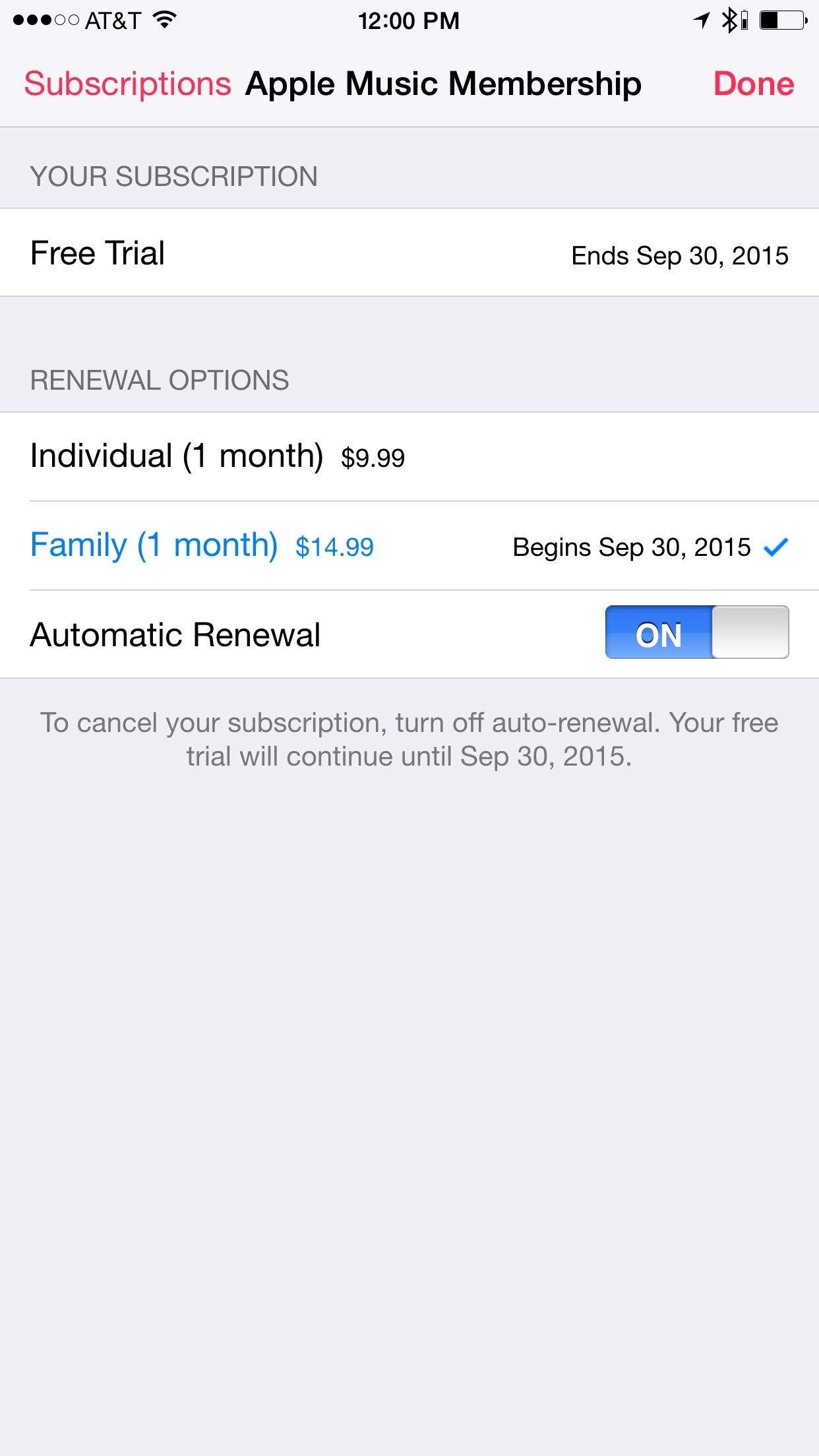 You’ll get a little warning that reminds you that you won’t have access to your Apple Music after the expiration date, but don’t worry. You can always re-subscribe any time before (and probably after) your September 30 renewal date with a quick tap on the subscription model you want.