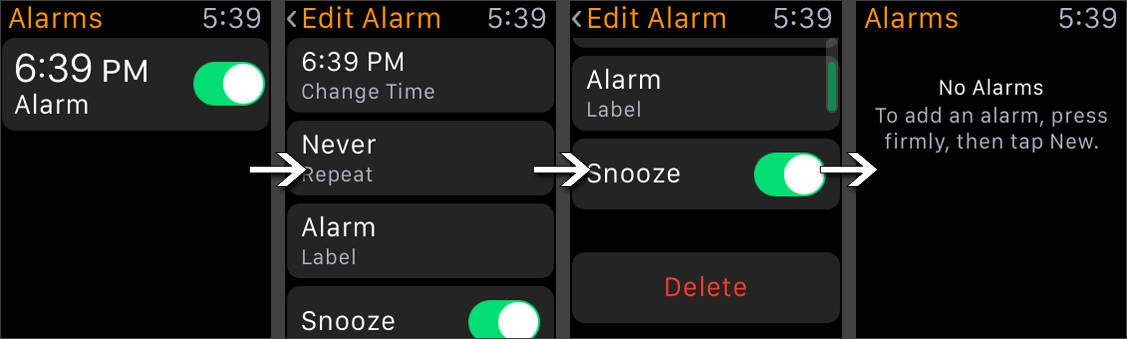 Tap the alarm you want to clear; that will take you to the Edit screen. Down at the bottom, you can hit Delete, and that will clear it. Now, all you have to do is repeat that for every alarm in your Apple Watch, and you’ll be done.