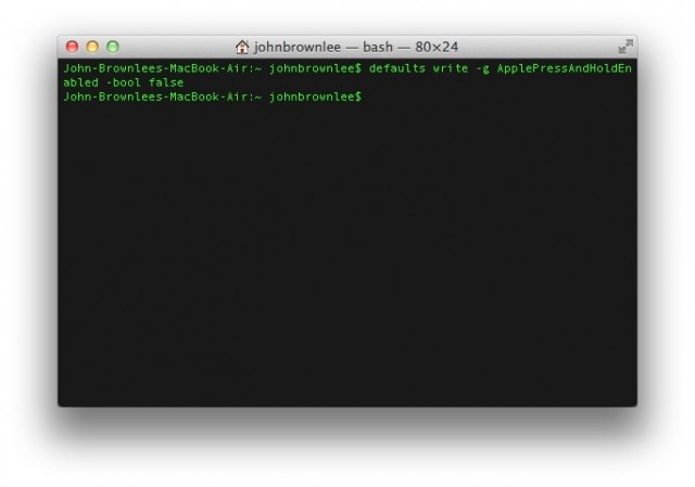 defaults write -g ApplePressAndHoldEnabled -bool false