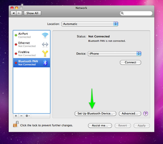 If you have not paired your iPhone with your Mac, you’ll need to pair them now. To pair your devices after you’ve added the Bluetooth Connection Option, select the “Set Up Bluetooth Device” option in the Network pref pane.